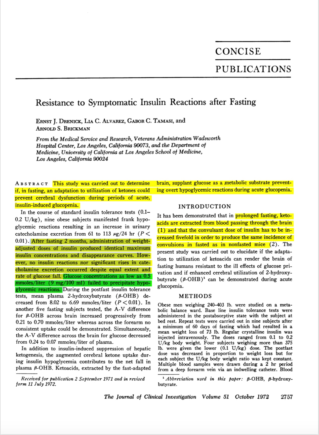 "After fasting two months, administration of weight-adjusted doses of insulin (...) glucose concentrations as low as 0.5 mmol/l (9mg/100ml) failed to precipitate hypoglyemic reactions."