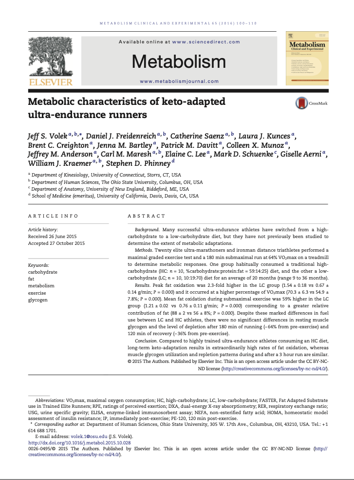 In summary, these results provide the first documentation of the metabolic adaptations associated with long-term con- sumption of a very low-carbohydrate/high-fat diet in highly trained keto-adapted ultra-endurance athletes. The enhanced ability to oxidize fat during exercise across a range of intensities is striking, as is the ability to maintain “normal” glycogen concentrations in the context of limited carbohydrate intake. Keto-adaptation provides an alternative to the supremacy of the high-carbohydrate paradigm for endurance athletes.