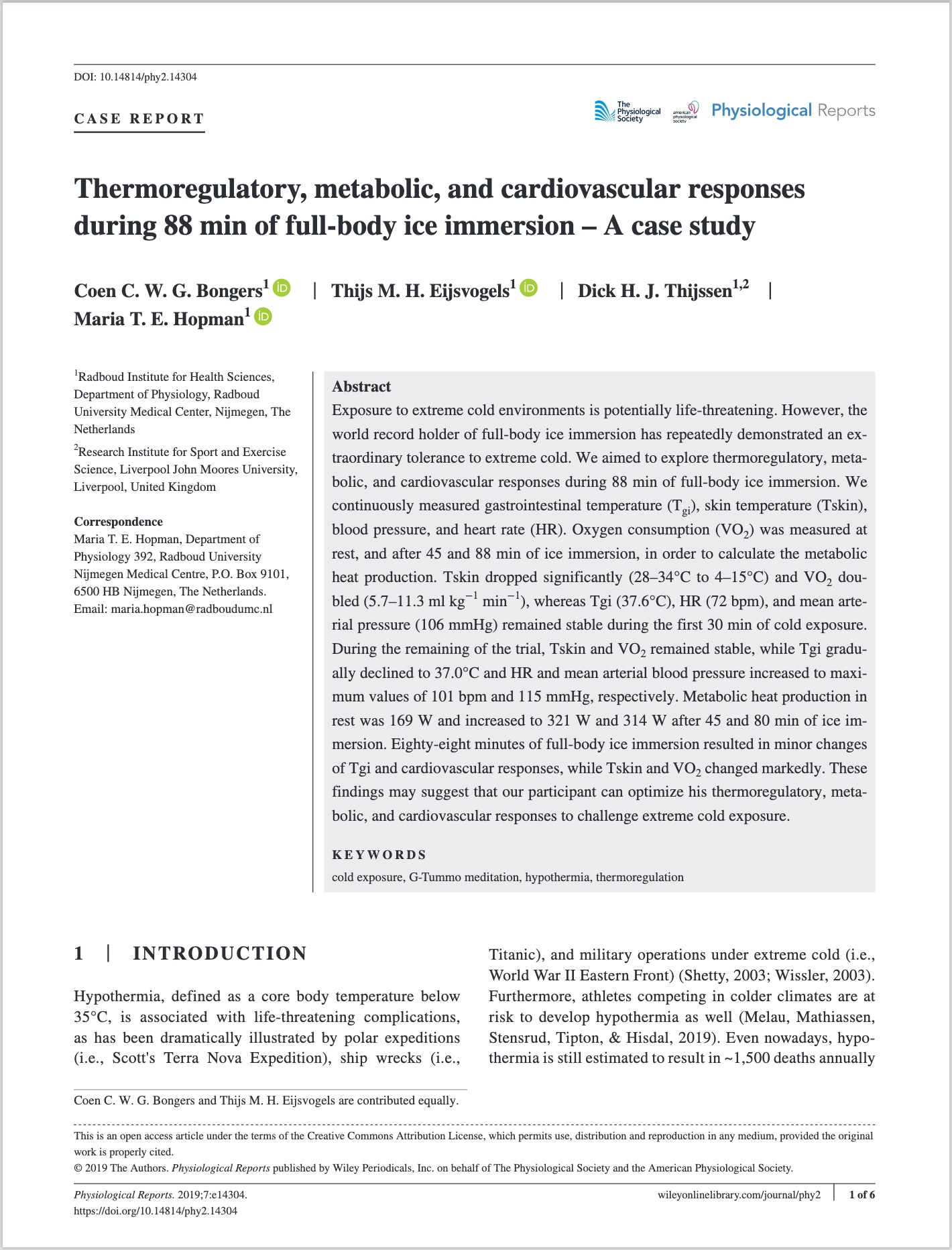 Etude Froid et Respiration/Méditation G-Tummo: "Thermoregulatory, metabolic, and cardiovascular responses during 88 min of full-body ice immersion – A case study"